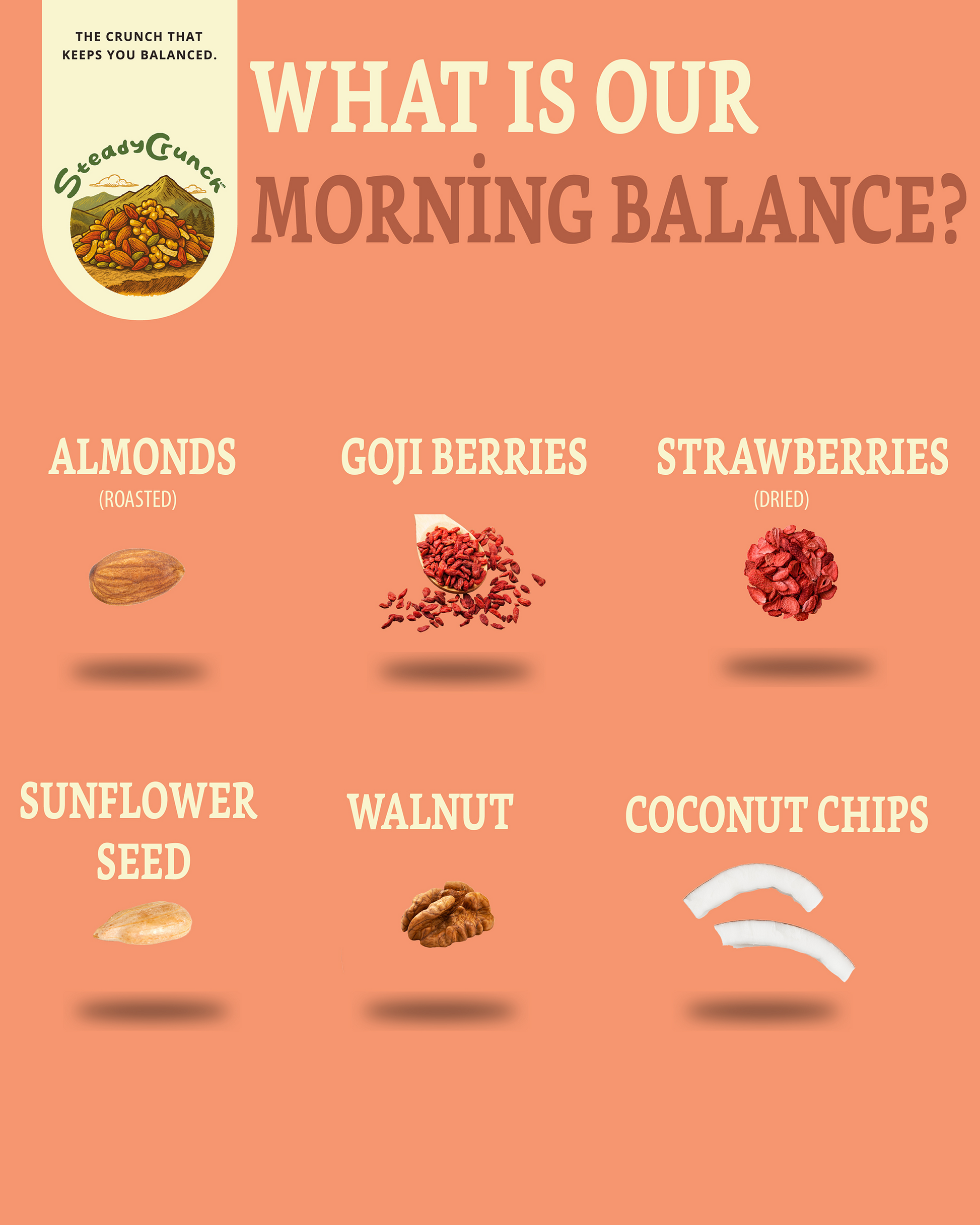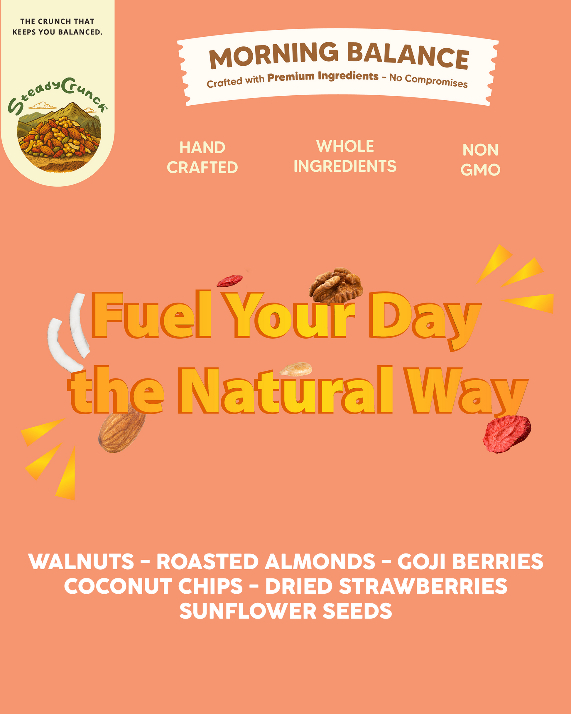 Walnuts - Roasted Almonds - Goji Berries - Coconut Chips - Dried Strawberries - Sunflower Seeds
